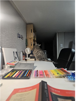 숙제 중인 이 여사님의 책상을 침범한 아기 고양이 사월이