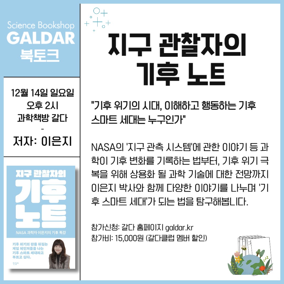 2025년 12월 14일 (일) 오후 2시, 삼청동 과학책방 갈다에서 『지구 관찰자의 기후 노트』 저자 이은지 박사님의 북토크가 열립니다!